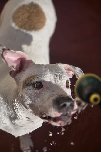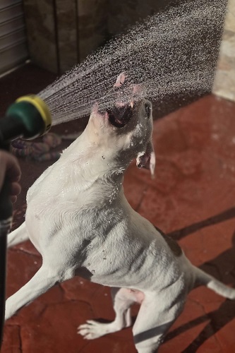 Bianca has lived here most of her life. When she arrived, she was practically a puppy. She's a gentle and well-balanced dog who walks very well on a leash and is very well-behaved. She's an Argentinian Mastiff mix. She's not good with cats, but she gets along well with other dogs, provided they're introduced properly. She's very affectionate and good-natured.